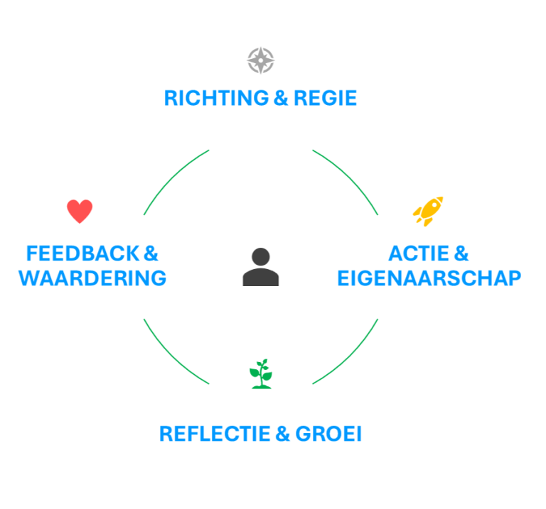 Onze gesprekscyclus met minimale voorbereidingstijd en automatisch aangemaakte reflecties zorgen voor diepgang, eigenaarschap en duurzame impact.